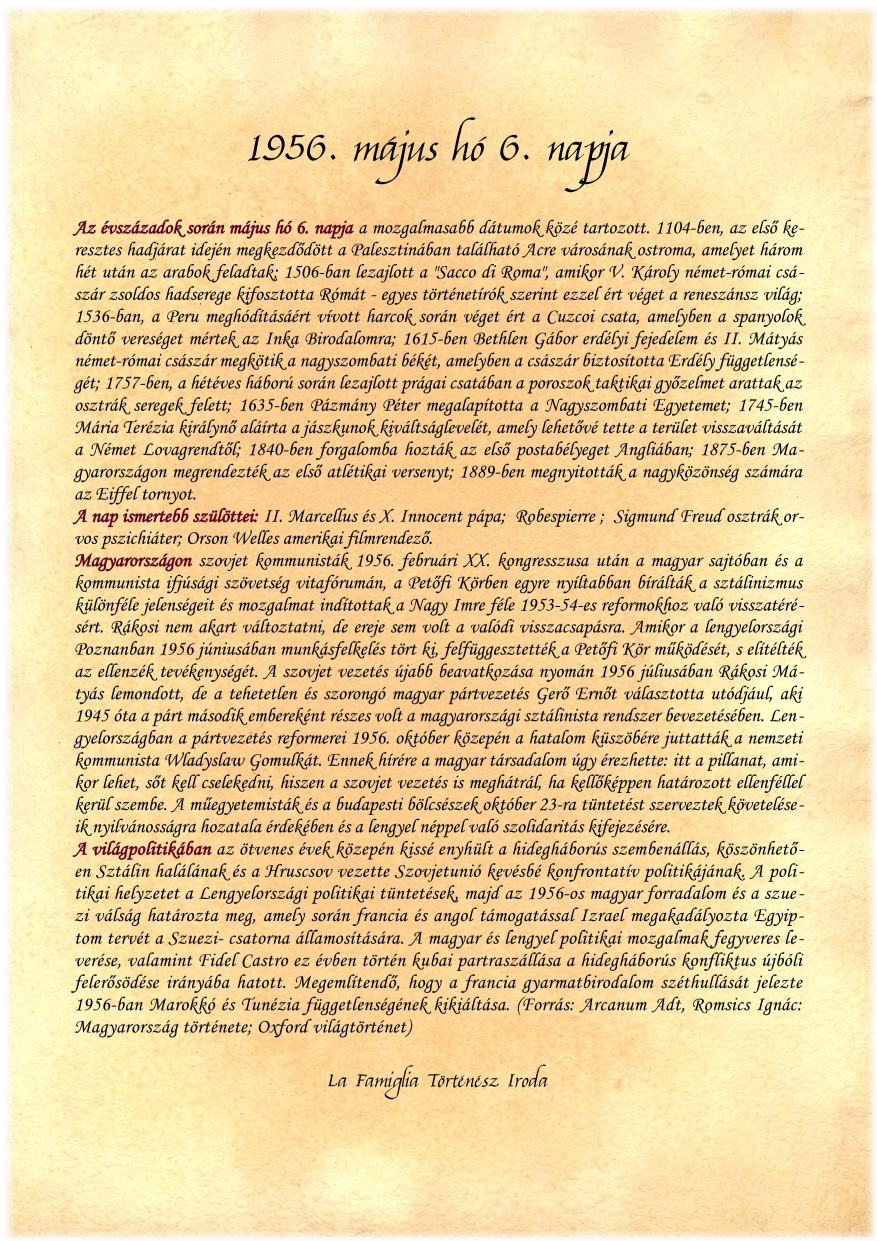 Az oklevél másik oldala az adott év legfontosabb történelmi eseményeinek összefoglalóját tartalmazza, hogy az ünnepelt lássa, milyen korszakban kezdődött az ő története. Ezen kívül az adott naphoz kötődő jeles eseményeket is megemlítjük a történelem különböző századaiból. Szintén kitérünk az ismertebb személyekre, akik ugyanazon a napon születtek. Ezen kívül, külön igény esetén egyéni asztrólógiai összefoglalót is beillesztünk, amely a születésnap csillagjegyét és jellemzőit is bemutatja. A szöveg ezen része modern, olvasmányos megfogalmazásban készül, mindezt régies kalligráfiával és klasszikus betűtípussal nyomtatjuk elegáns, vastag kartonra.